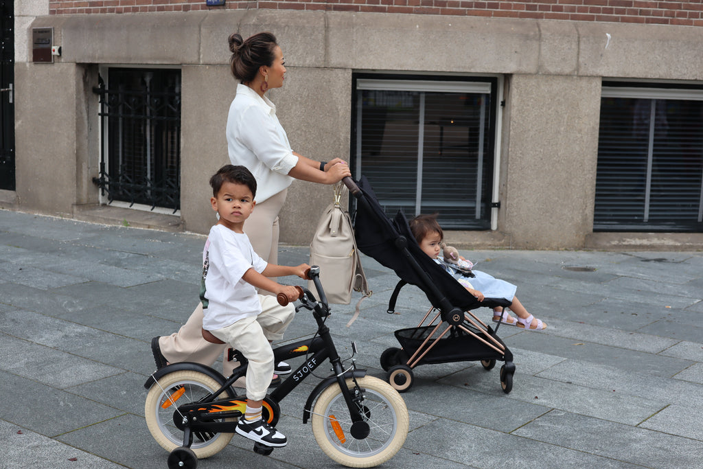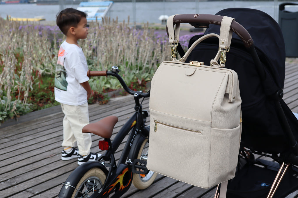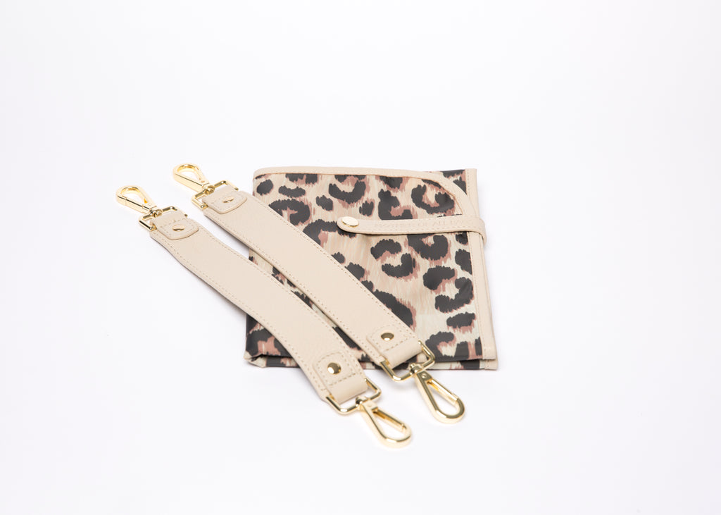 Baby Essentials: Includes a changing mat of water repellent custom lining, made of recycled PET bottles in a leopard print combined with leather straps in matching colour, so can you change your baby on-the-go and attache the N˚1 mombag to a stroller.